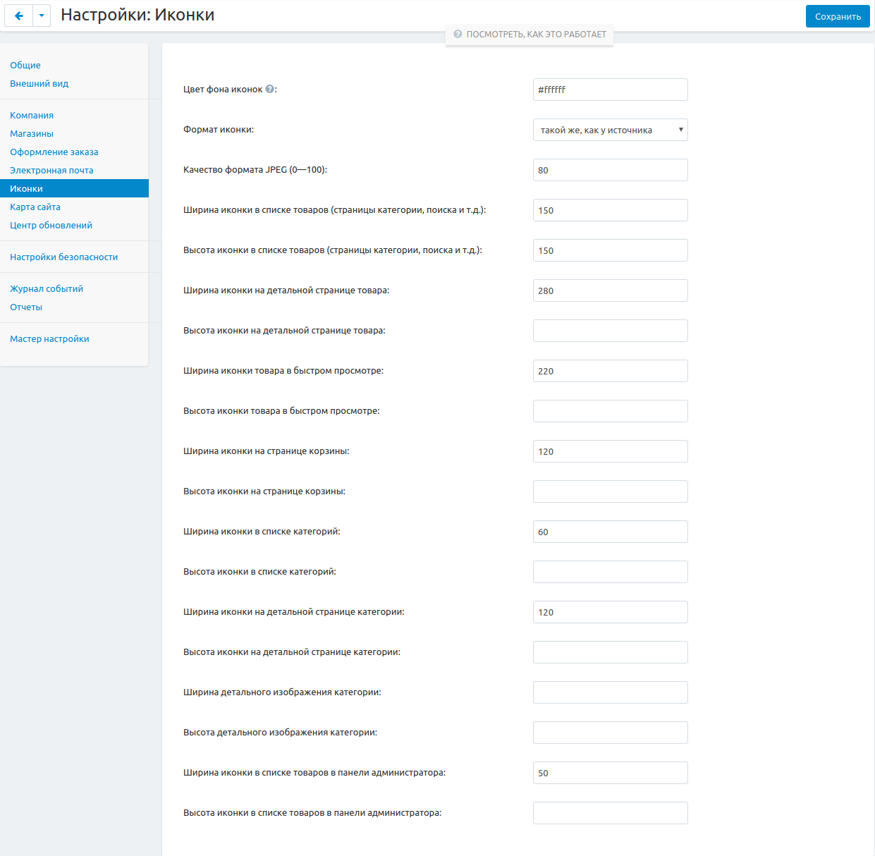 Чтобы настроить размер изображений на витрине, заполните соответствующие поля рядом с нужным типом иконки.