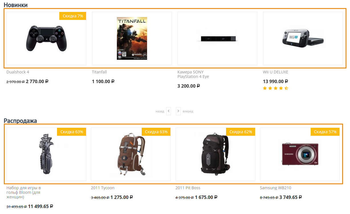 В блоке “Товары”, который на разных страницах может выполнять разные функции, например, “Горячие предложения”, “Распродажа”, “Новые поступления” и т.д.
