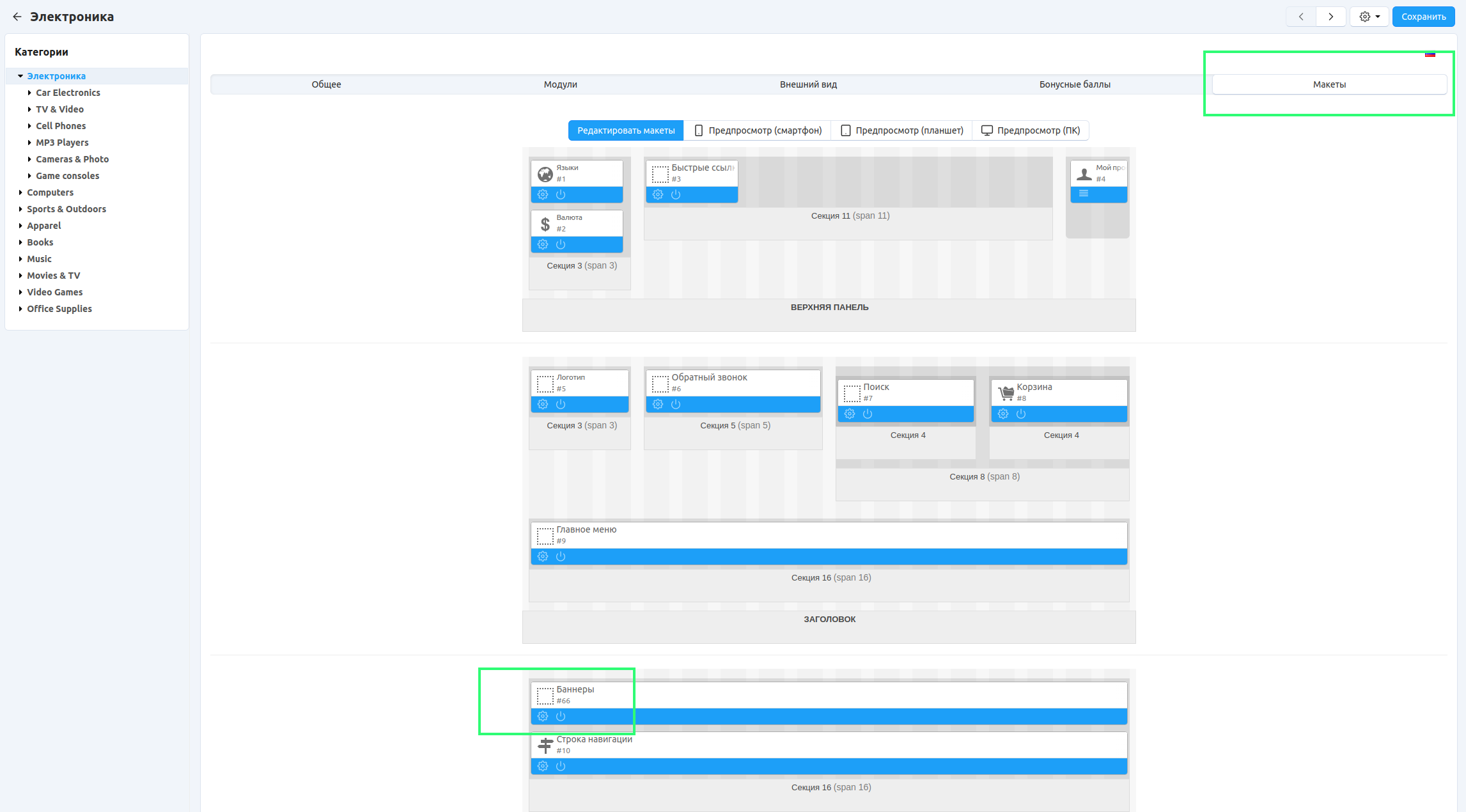 В панели администратора откройте страницу Веб-сайт → Темы → Макеты и переключитесь на вкладку Категории.