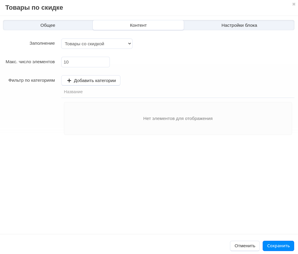 Переключитесь на вкладку Контент и в поле Заполнение выберите Товары со скидкой.