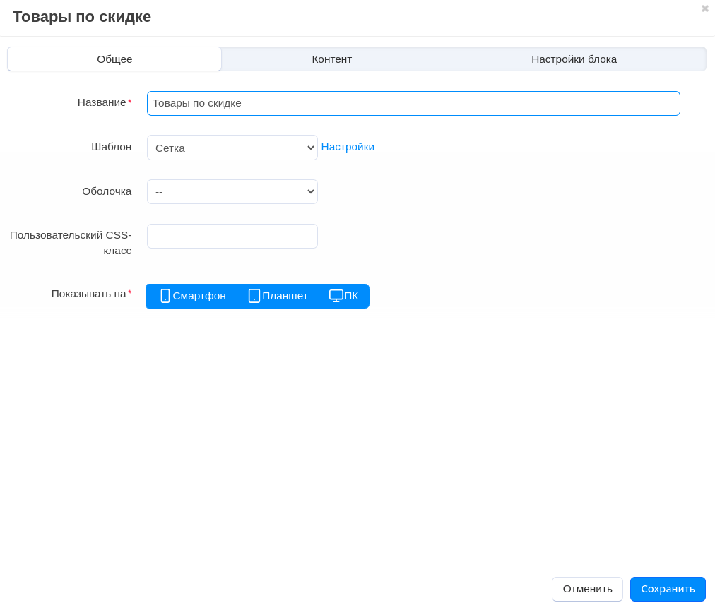 Переключитесь на вкладку Создать новый блок и выберите тип блока Товары. В открывшемся окне: