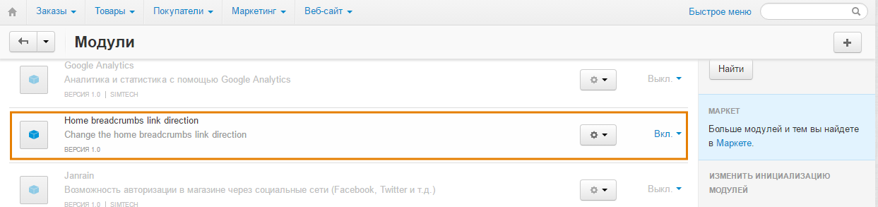 1. После установки модуль Home Breadcrumbs Link Direction появится в списке. Нажмите на название модуля.