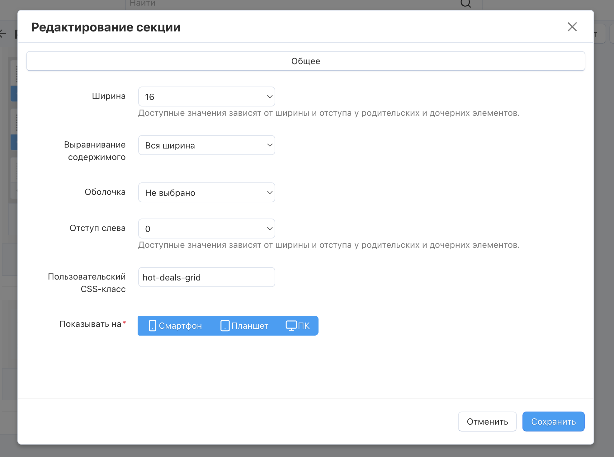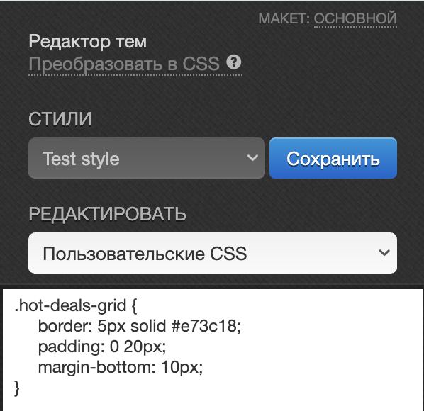 - Введите имя пользовательского класса в поле Пользовательский класс CSS, например hot-deals-grid, и сохраните изменения;
