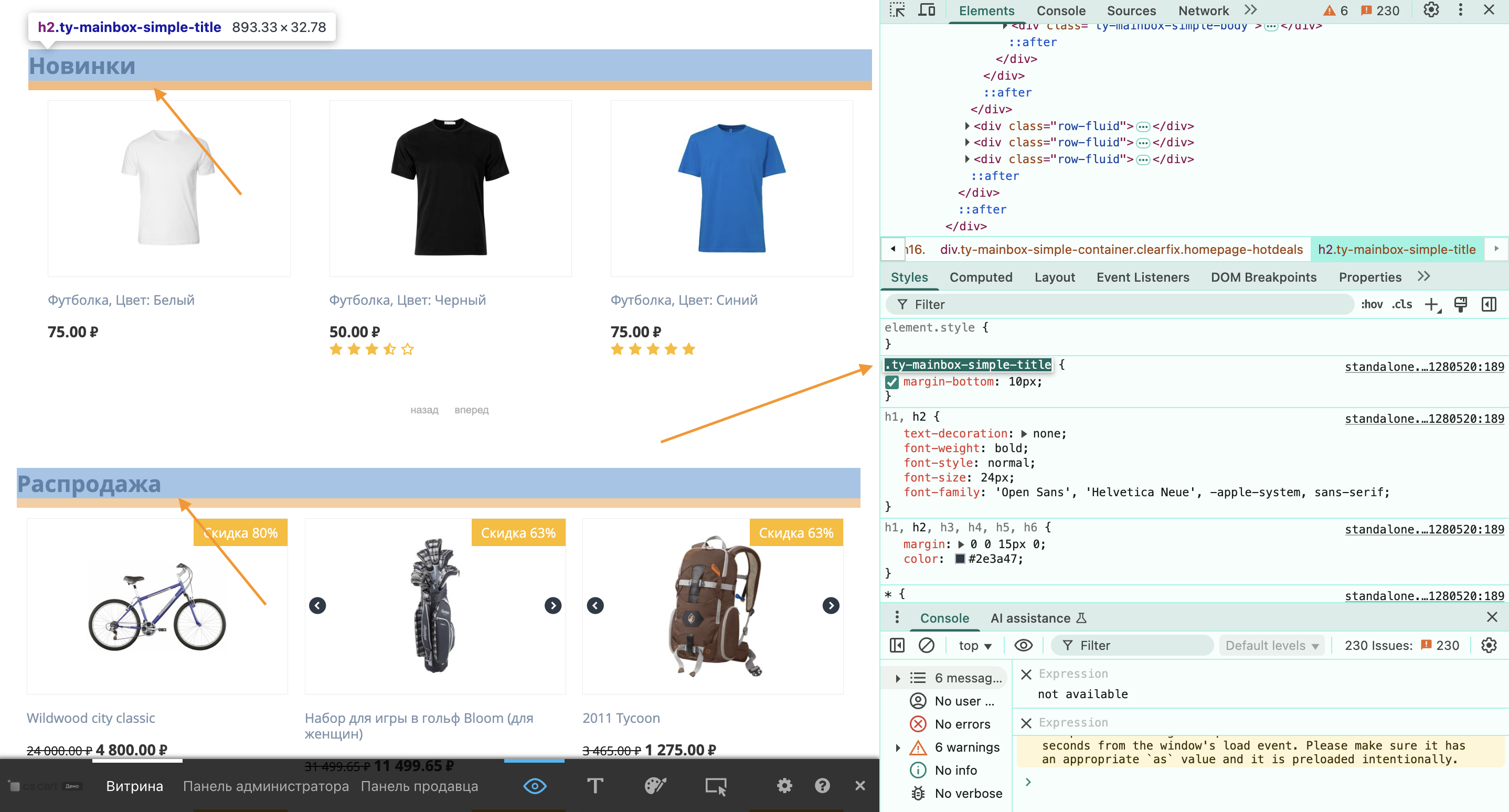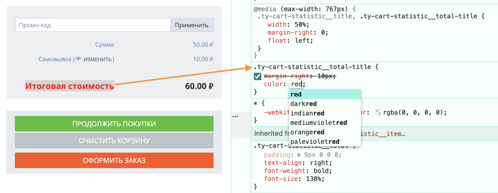 - Попробуйте: Вы можете изменять свойства CSS непосредственно на панели «Стили». Это позволит вам увидеть, как потенциальные изменения будут выглядеть в реальном времени. После того, как вы будете удовлетворены, скопируйте окончательный CSS в раздел «Пользовательский CSS» в CS-Cart.