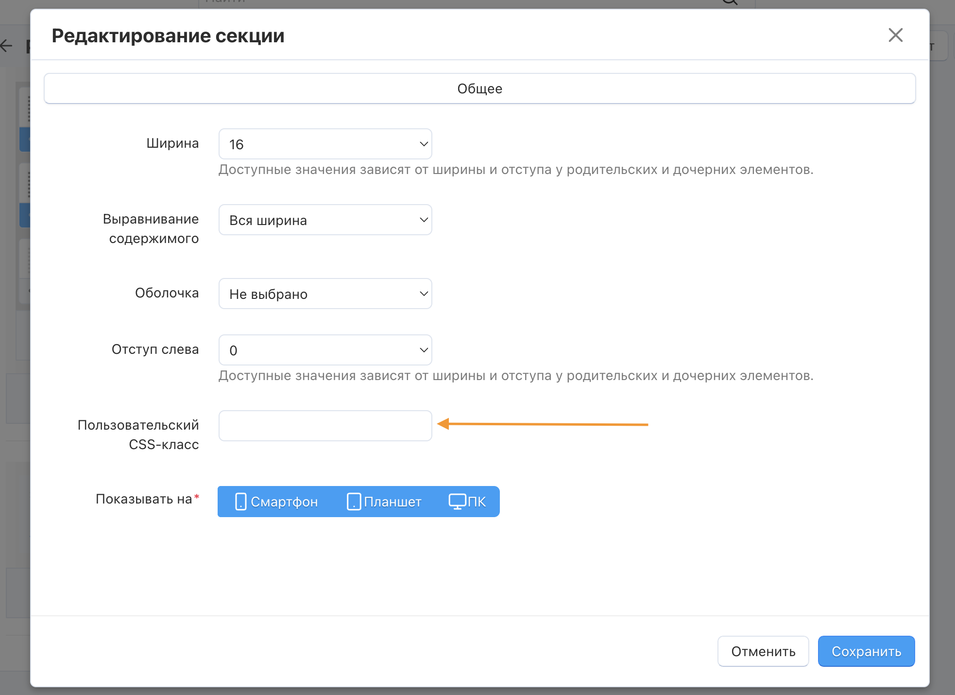 Поле “Пользовательский CSS-класс” можно найти на странице редактирования блока, секции, раздела, пункта меню и профиля.
