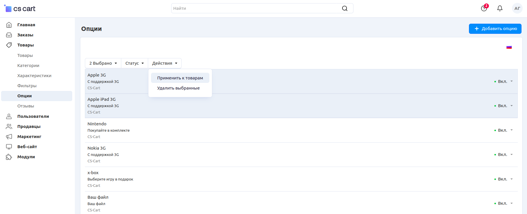 Как применить опцию сразу к нескольким товарам