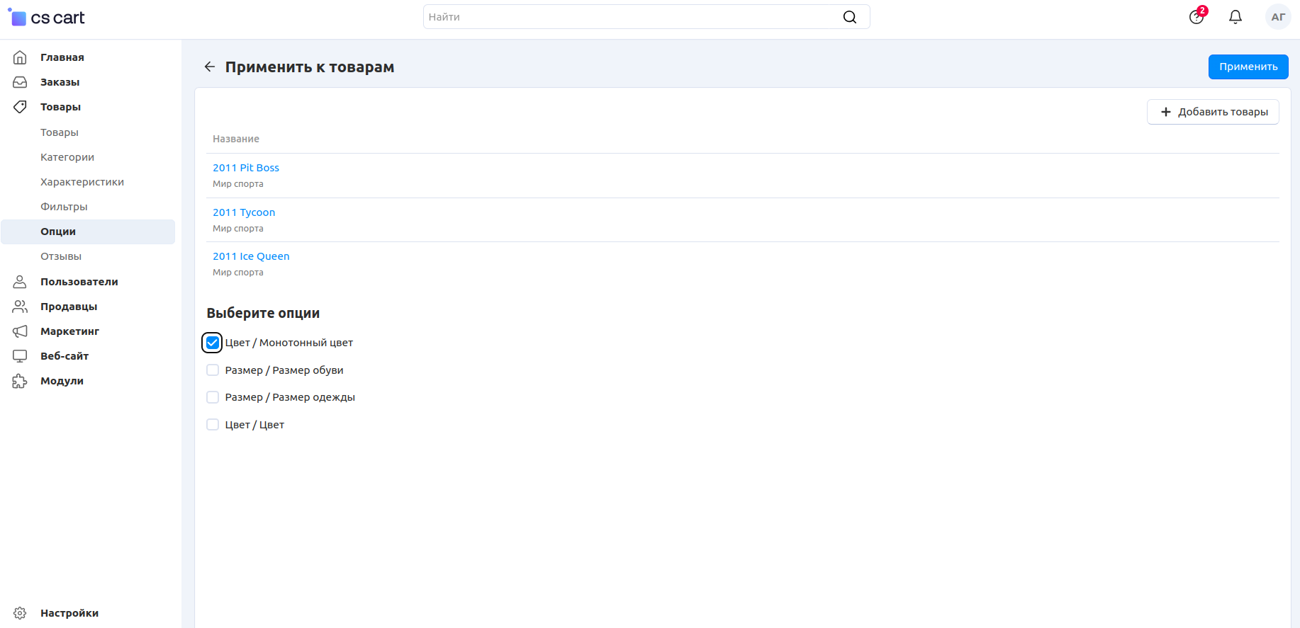 2. Выделите галочками нужные опции. Нажмите на кнопку с изображением шестерёнки в правой верхней части страницы и выберите Применить к товарам.