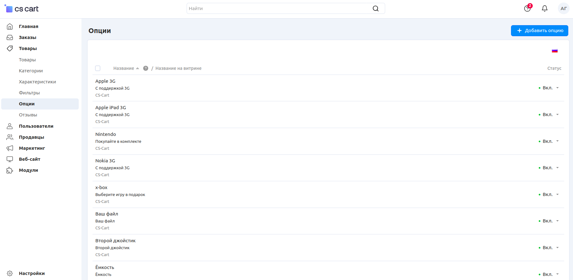 На странице Товары → Опции можно редактировать все опции товаров и их варианты в вашем магазине. Изменения здесь повлияют на все товары, у которых используется опция.