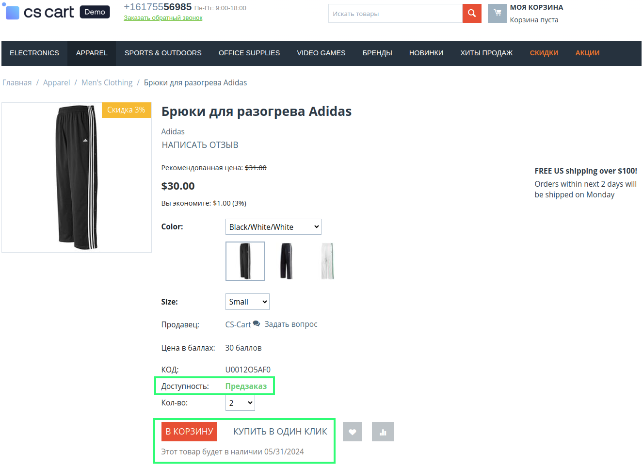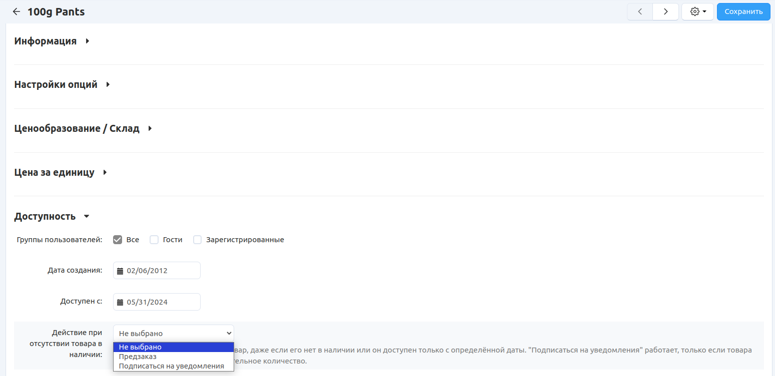 • Предзаказ — покупатель сможет купить товар заранее, независимо от того, сколько экземпляров товара сейчас в наличии и указана ли дата доступности товара.