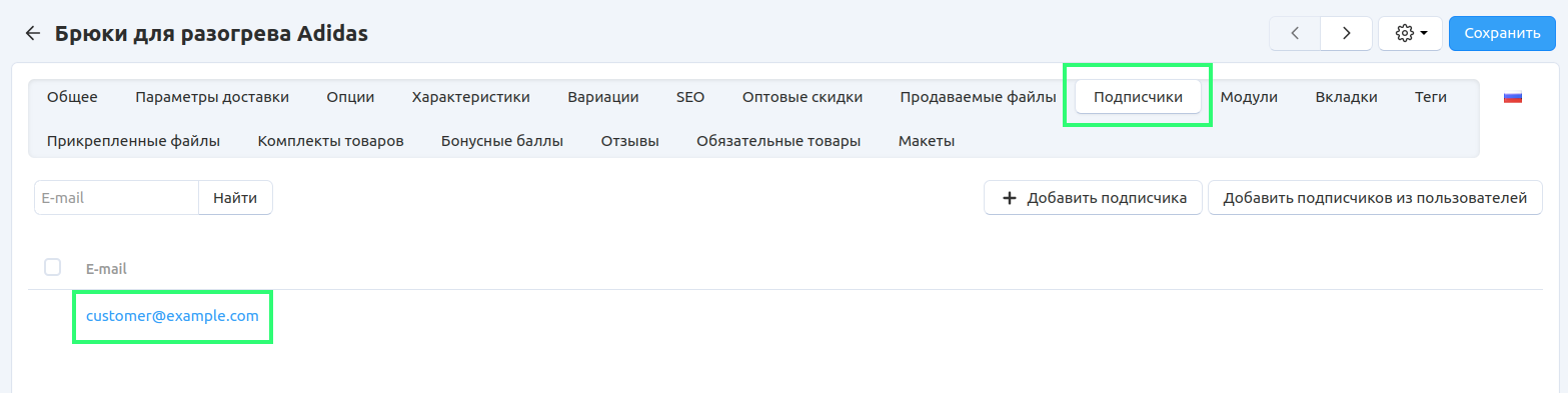 • Чтобы увидеть подписчиков на конкретный товар, откройте страницу Товары → Товары, нажмите на название нужного товара и перейдите на вкладку Подписчики.