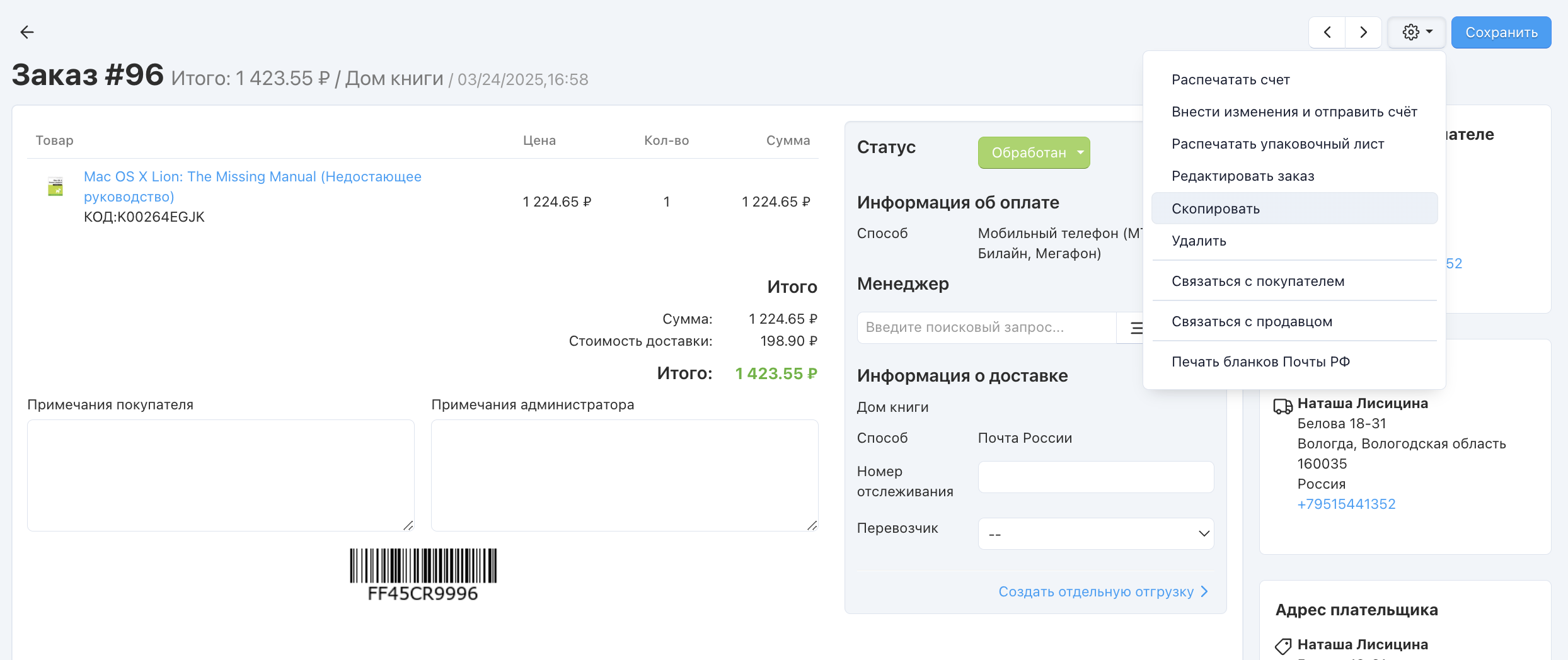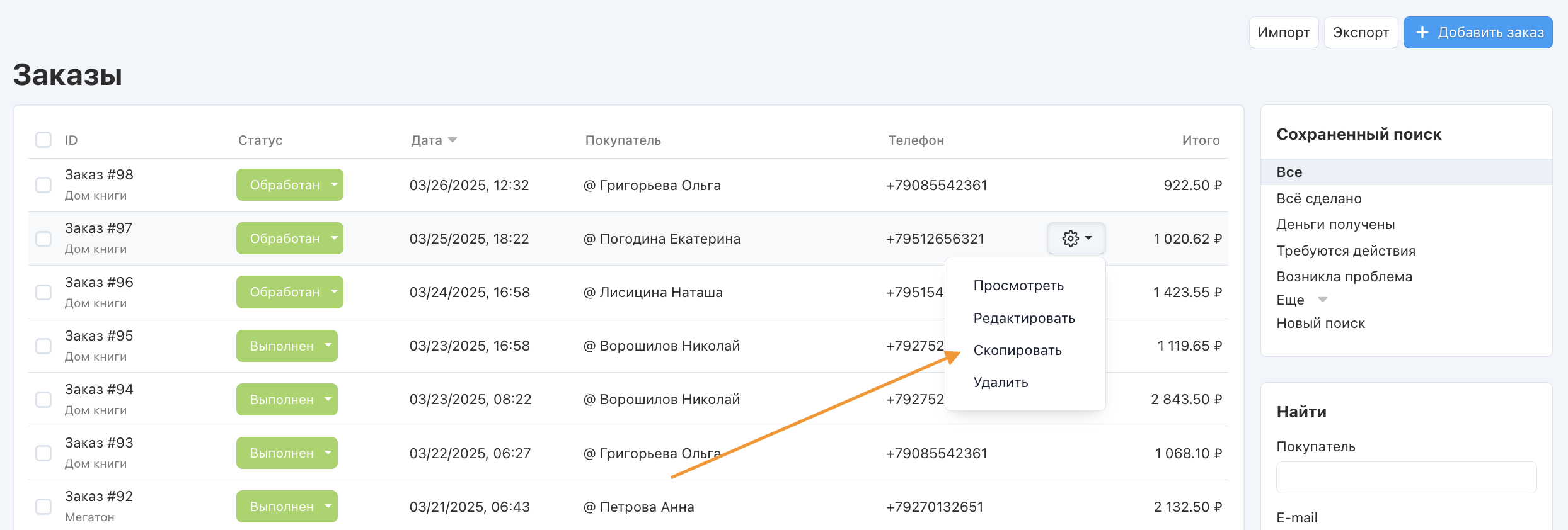 Вы можете копировать заказы, чтобы не вводить заново данные покупателя и не выбирать заказанные товары. Чтобы скопировать заказ: