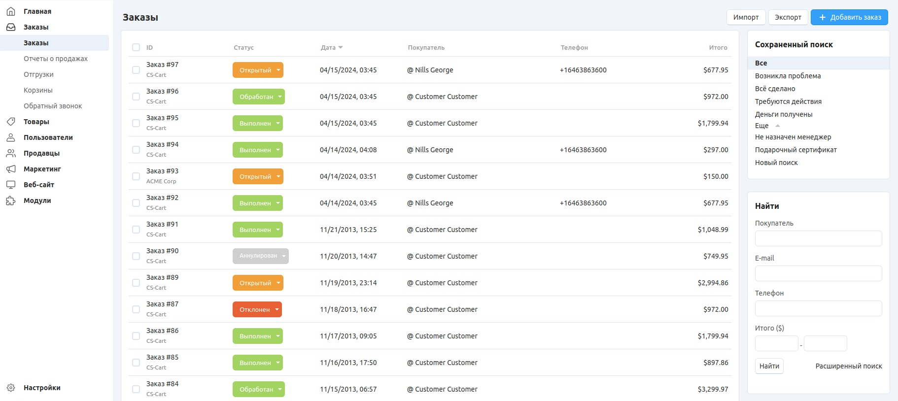 На странице Заказы → Заказы выводится список всех заказов в магазине, которые были сделаны и не были удалены. По умолчанию, заказы отсортированы по дате: чем новее заказ, тем он выше в списке.