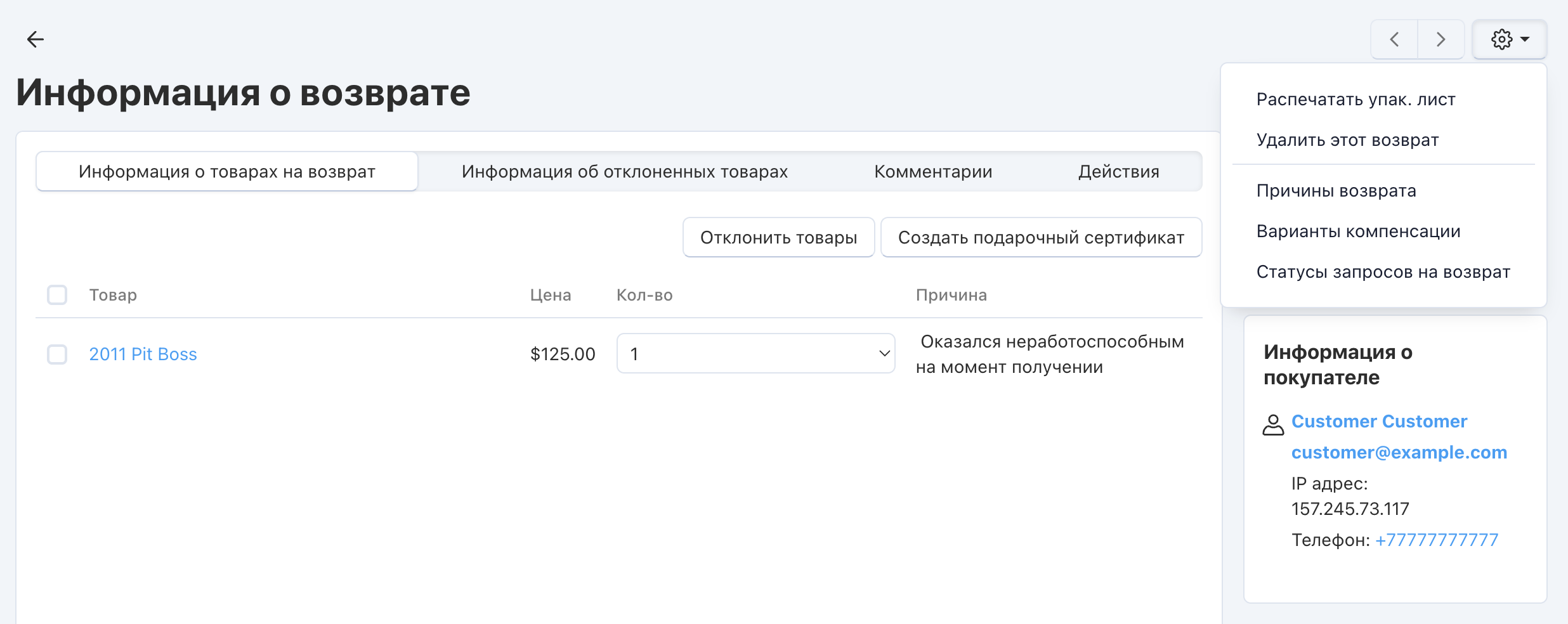 Раздел состоит из 4 подразделов: Запросы на возврат, Причины возврата, Варианты компенсации и Статусы запросов на возврат. Чтобы переключаться между подразделами, используйте кнопку с изображением шестерёнки.