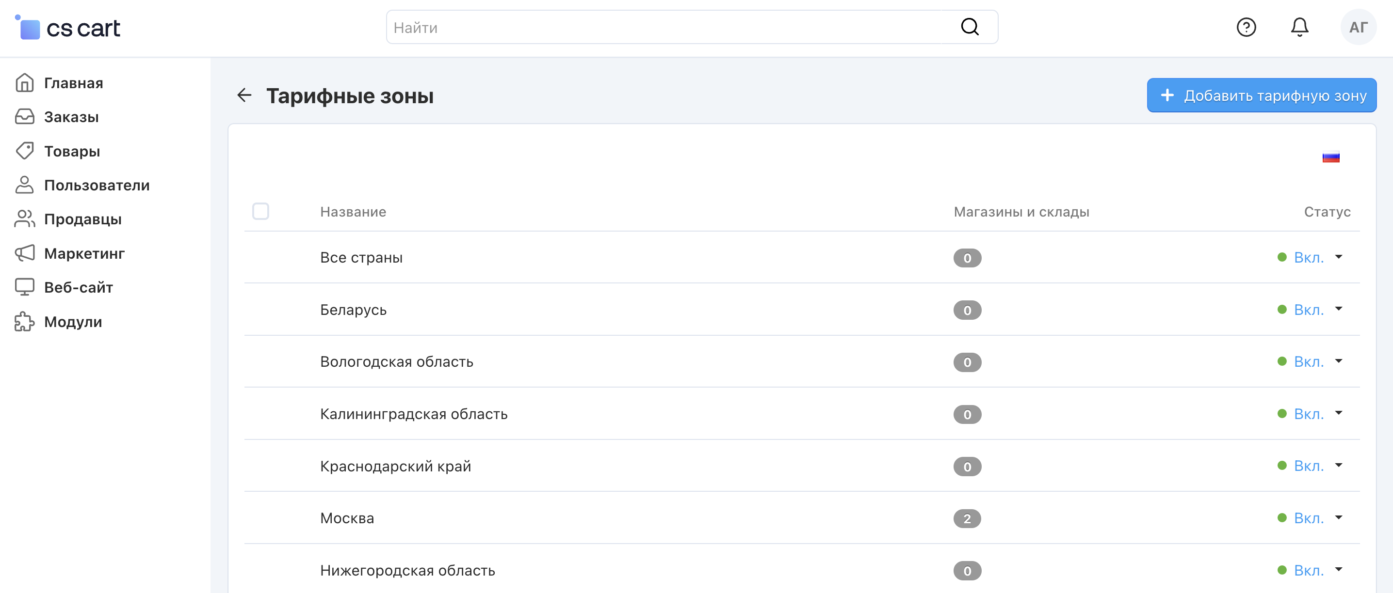 На странице Настройки → Способы доставки → Тарифные зоны можно редактировать места, в которые ваш магазин осуществляет доставку. Тарифная зона — это набор параметров, которые относятся к определённой географической области.
