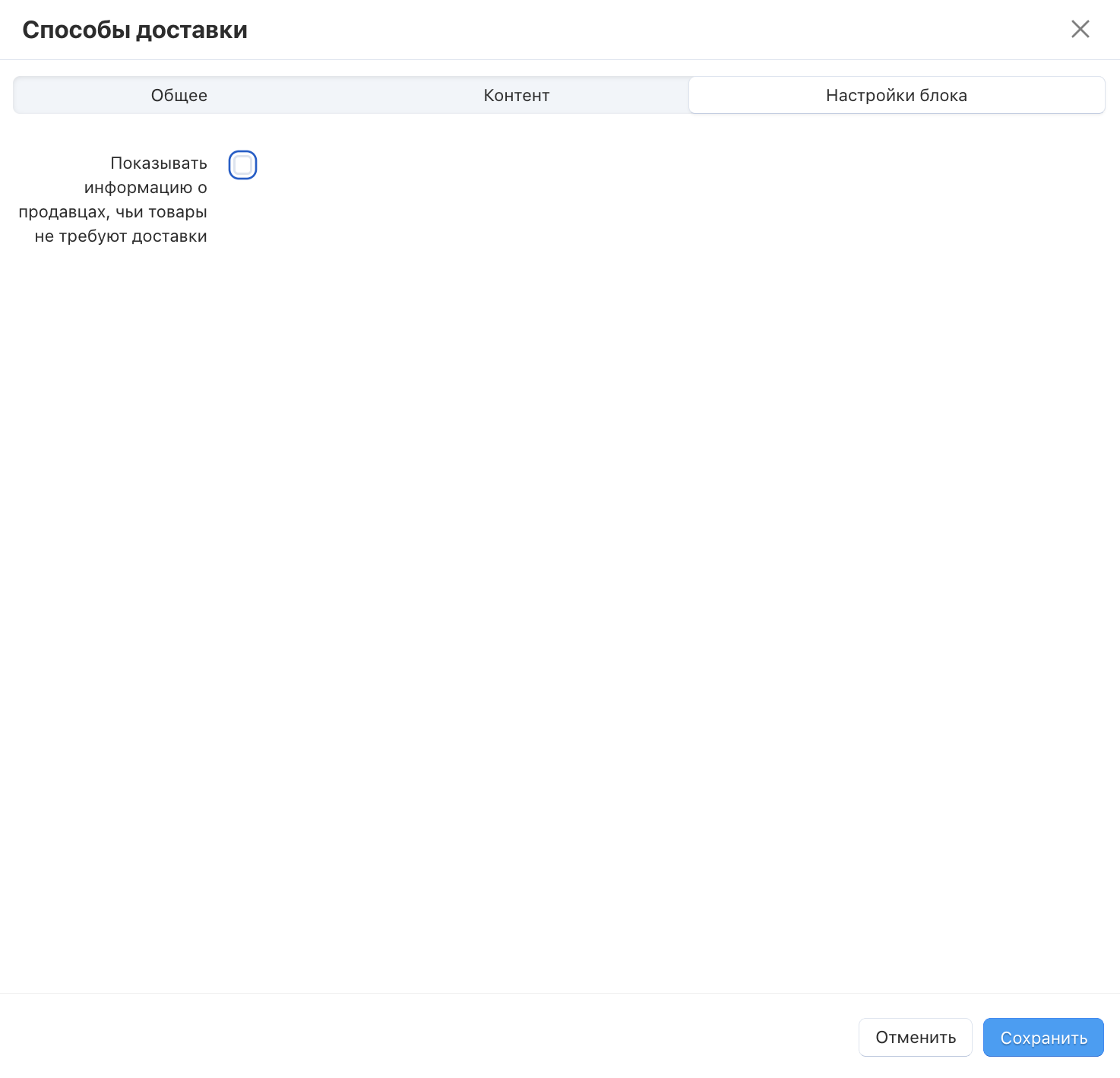 - На вкладке Настройки блока оставьте пустым флажок Показывать информацию о продавцах, чьи товары не требуют доставки