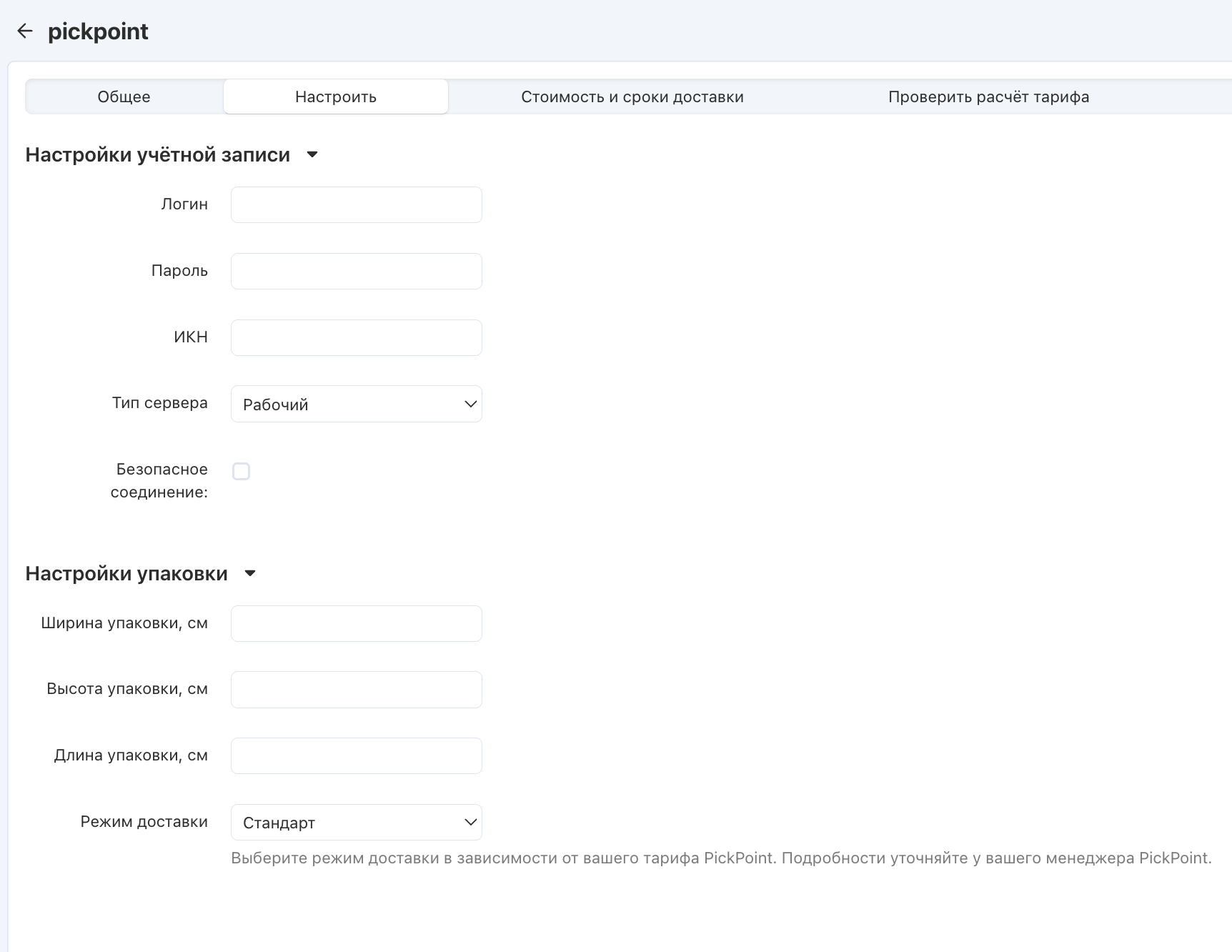 Логин Логин полученный в Pickpoint Пароль Пароль полученный в Pickpoint ИКН ИКН полученный в Pickpoint Тип сервера Тестовый или рабочий сервер, используемый для передачи данных Безопасное соединение При включении данной настройки, для передачи данных будет использоваться безопасное соединение Настройки упаковки Ширина, высота, длина упаковки в см Режим доставки Выберите режим доставки в зависимости от вашего тарифа PickPoint. Подробности уточняйте у вашего менеджера PickPoint.