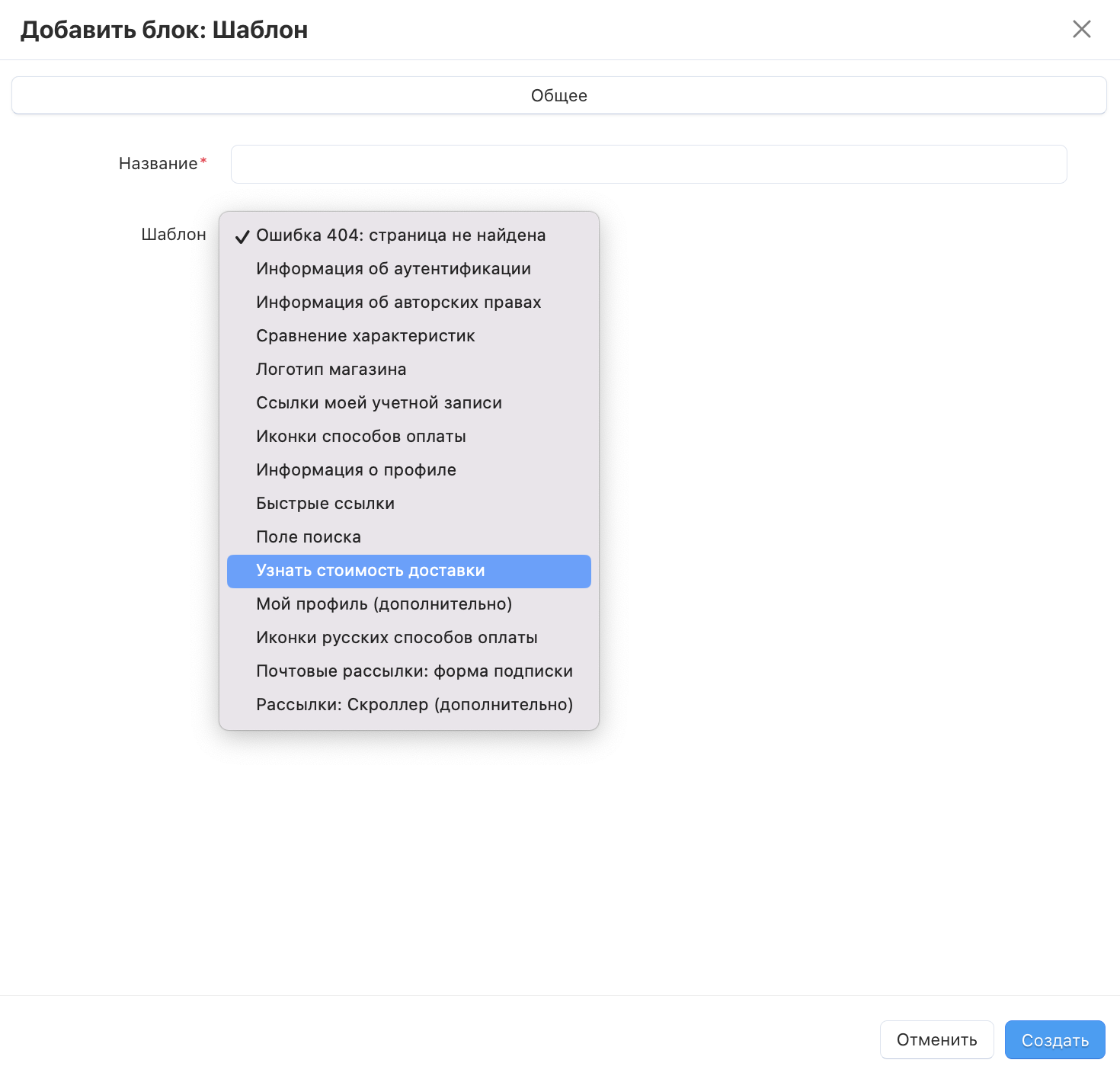 3. Создайте новый блок Шаблон с шаблоном Узнать стоимость доставки в любой секции.