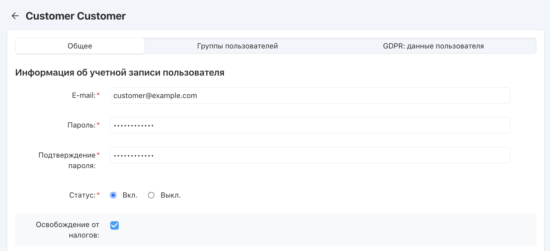 Галочку Освобождение от налогов можно поставить только в профилях пользователей с типом “Покупатель”.