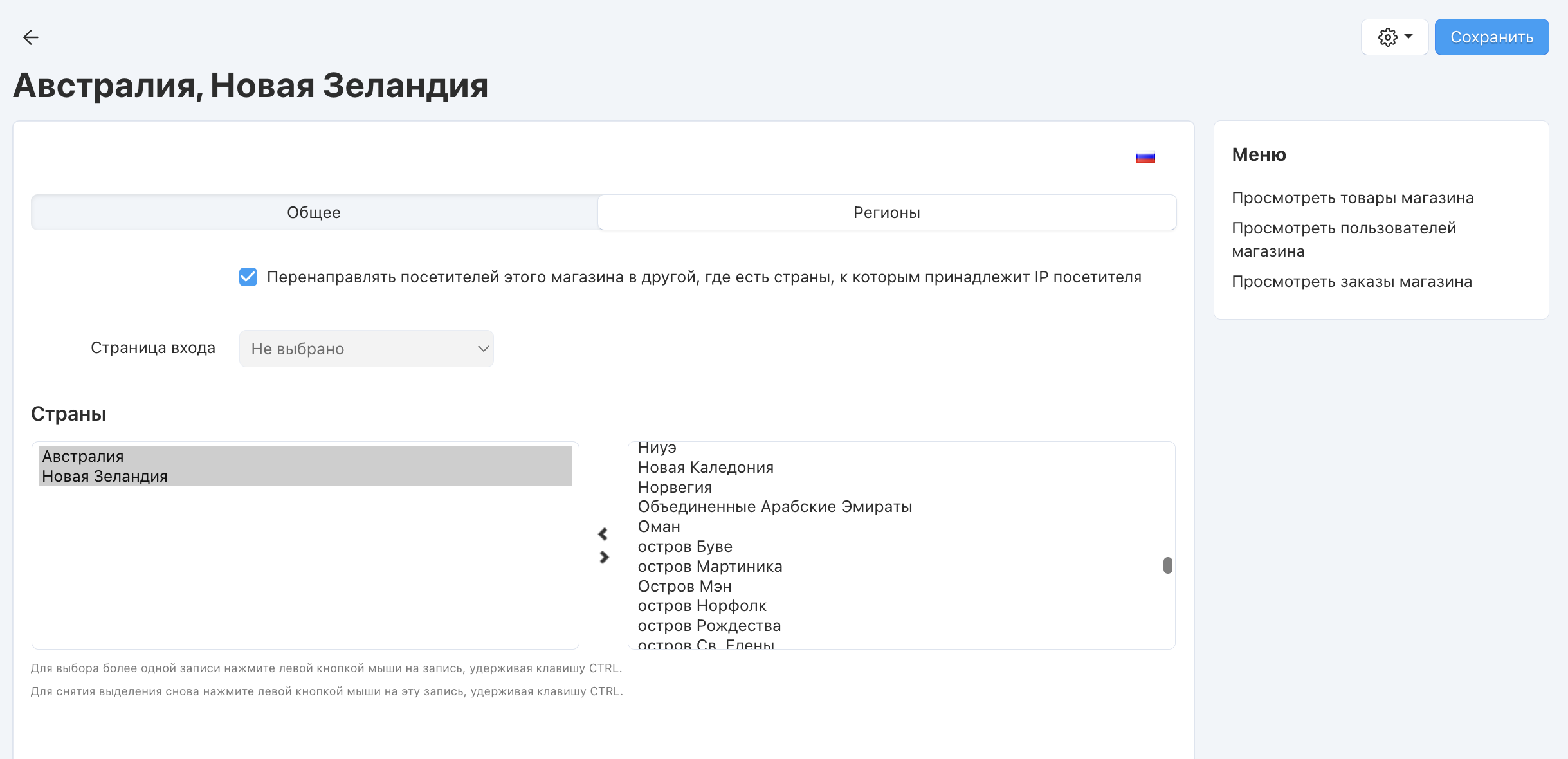 Поле справа содержит список доступных стран; поле слева содержит список стран, привязанных к выбранной витрине. Если в поле слева не указана ни одна страна, общая точка входа не будет перенаправлять покупателей на эту витрину.
