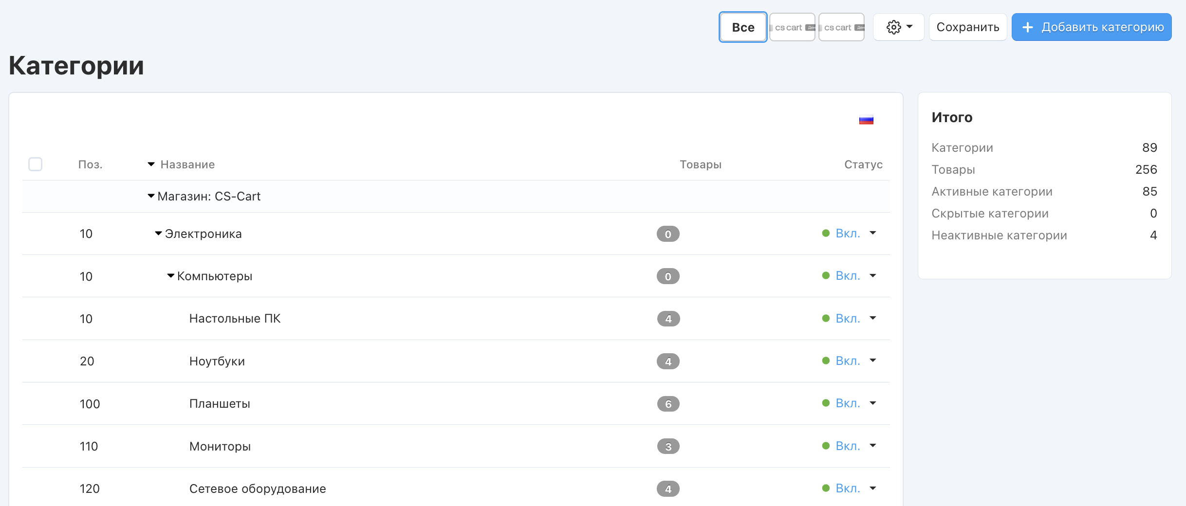 В CS-Cart используется общий каталог товаров для всех витрин. Каталог имеет древовидную структуру: корневые узлы являются витринами, а дочерние узлы, расположенные внутри корневых, представляют собой категории и подкатегории товаров, привязанные к соответствующим витринам.