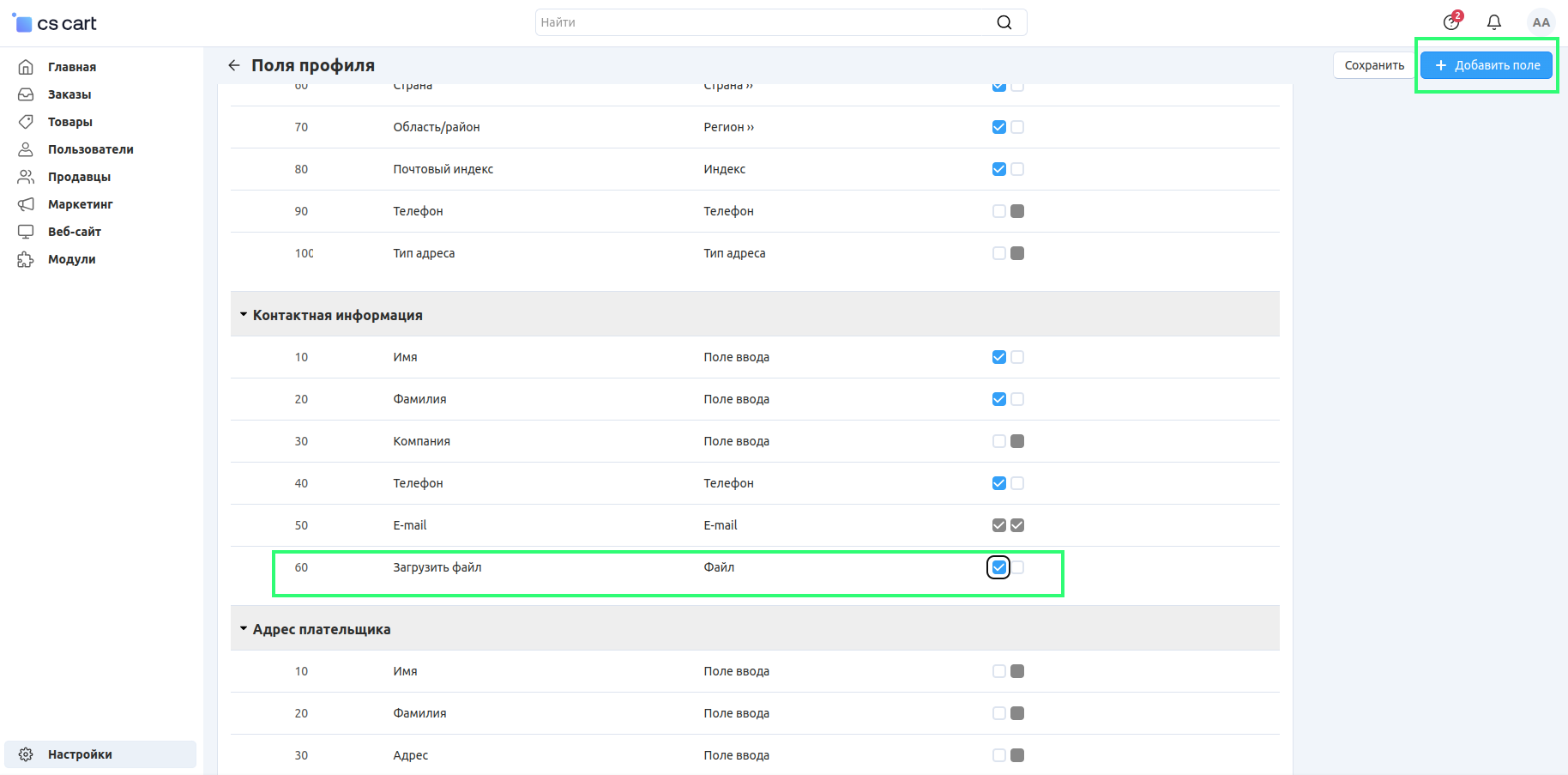 Поставьте галочку в поле Профиль (Показать). Вы также можете сделать загрузку документов обязательной при регистрации. Для этого поставьте галочку в поле Профиль (Обязательное).