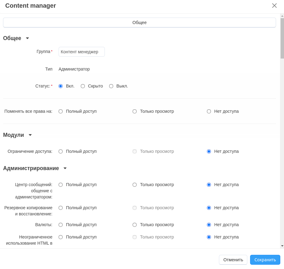 - Выкл. — группа нигде не появляется и никак не влияет на права пользователей.