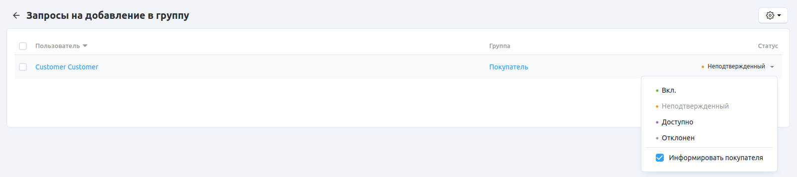 Покупатели могут подать запросы на вступление в группу на витрине (страница Учетная запись → Группы пользователей). Администратор магазина может одобрить или отклонить заявку.