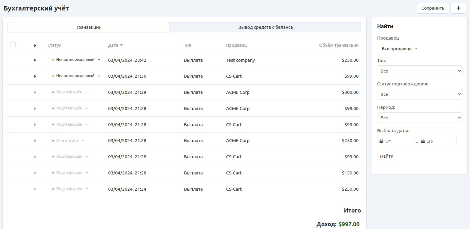 Информация о выплатах и комиссиях автоматически записывается на странице “Бухгалтерский учёт”. Так владельцам маркетплейса проще учитывать периодические платежи или плату за транзакцию при распределении денег между продавцами.