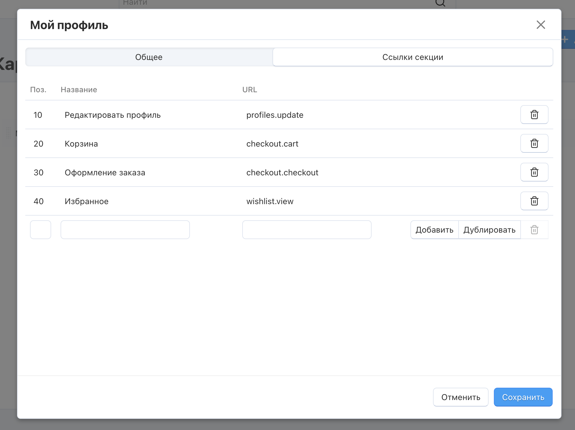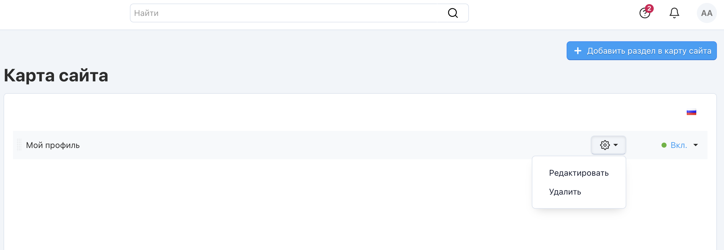 Существующие разделы редактируются и удаляются с помощью кнопок с изображением шестеренки.
