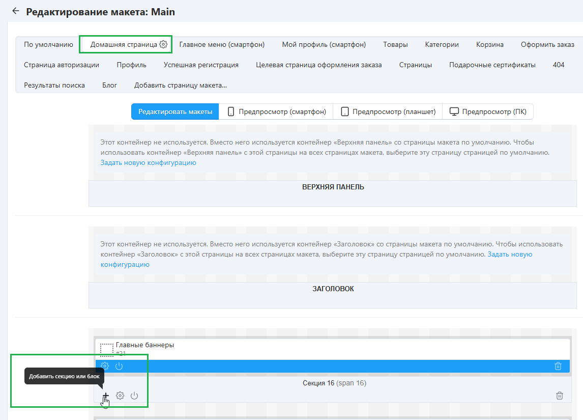 В панели администратора откройте страницу Веб-сайт → Темы → Макеты и переключитесь на вкладку Домашняя страница.