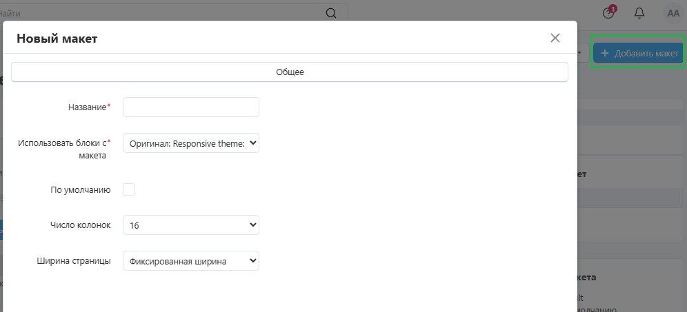 - Использовать блоки с макета (только при создании макета) — в выпадающем меню выберите макет, который хотите взять за основу для нового макета.