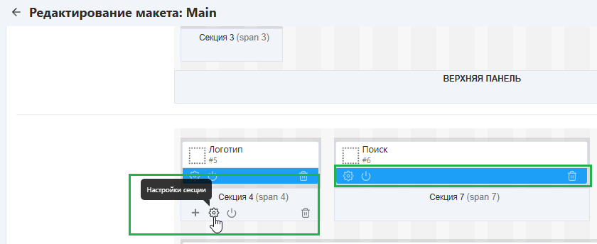 Здесь вы можете добавить новый элемент (например, блок или секцию), отредактировать или удалить его, а также включить и выключить отображение этого элемента.