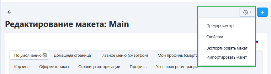 - кнопка шестеренки открывает меню редактирования макета для той страницы макета, на которой вы находились, когда нажали эту кнопку;