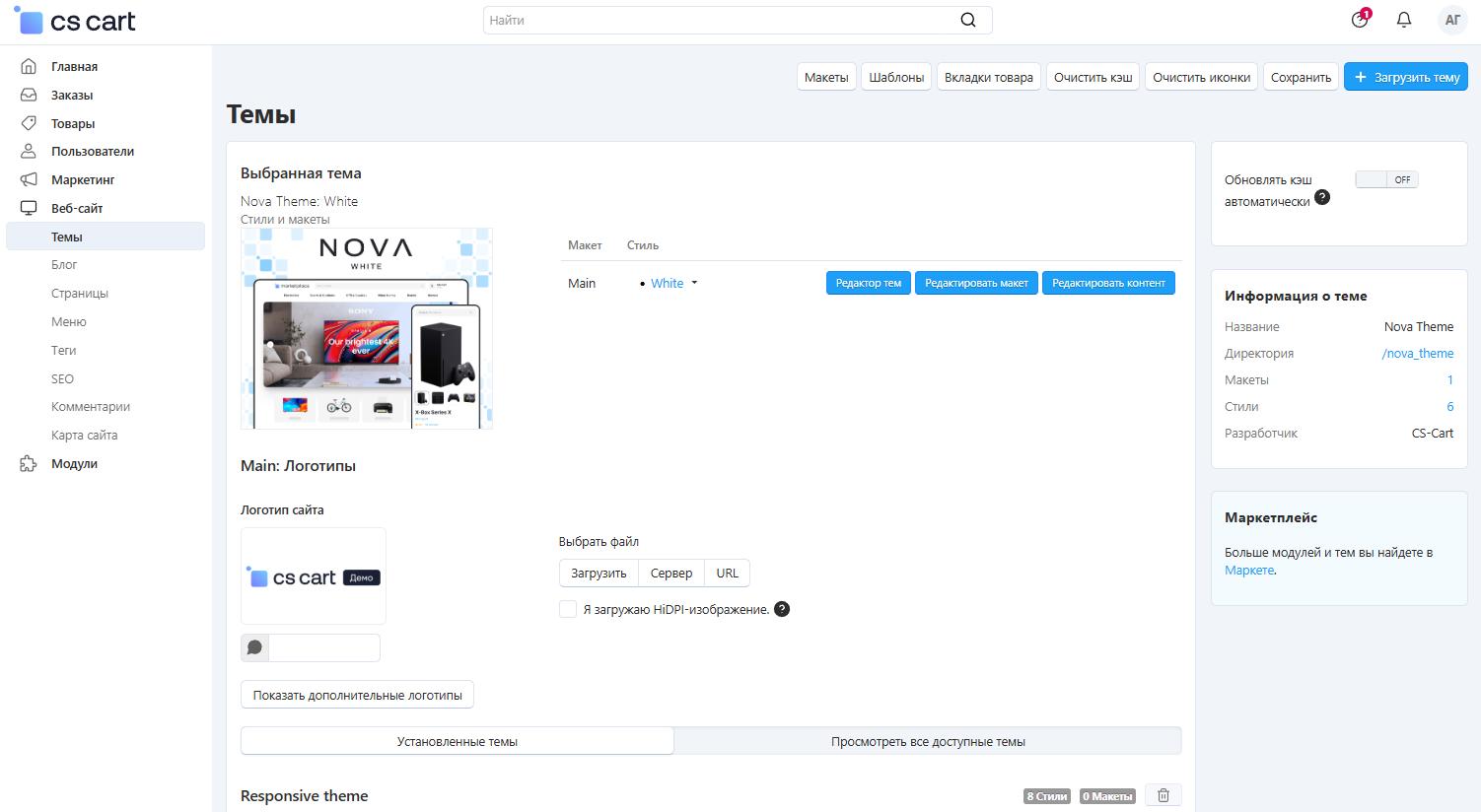 В разделе Веб-сайт → Темы в панели администратора вы можете выбирать, устанавливать, загружать, удалять и редактировать темы для вашего магазина.