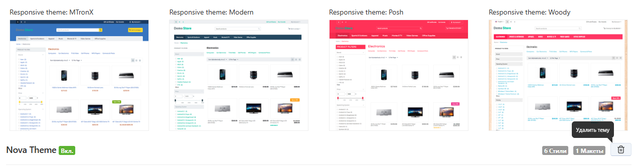 На вкладке Установленные темы доступен список тем с различными стилями, которые можно использовать в вашем магазине. Например, по умолчанию установлена тема Nova, к которой в комплекте идёт набор стилей—Blue, Red, White и т.д.