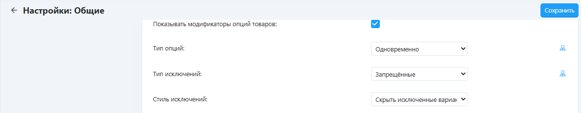 Настройка Тип опций появляется в том случае, если на странице Настройки → Общие настройки → Каталог разрешено менять значение этой настройки на уровне отдельных объектов.