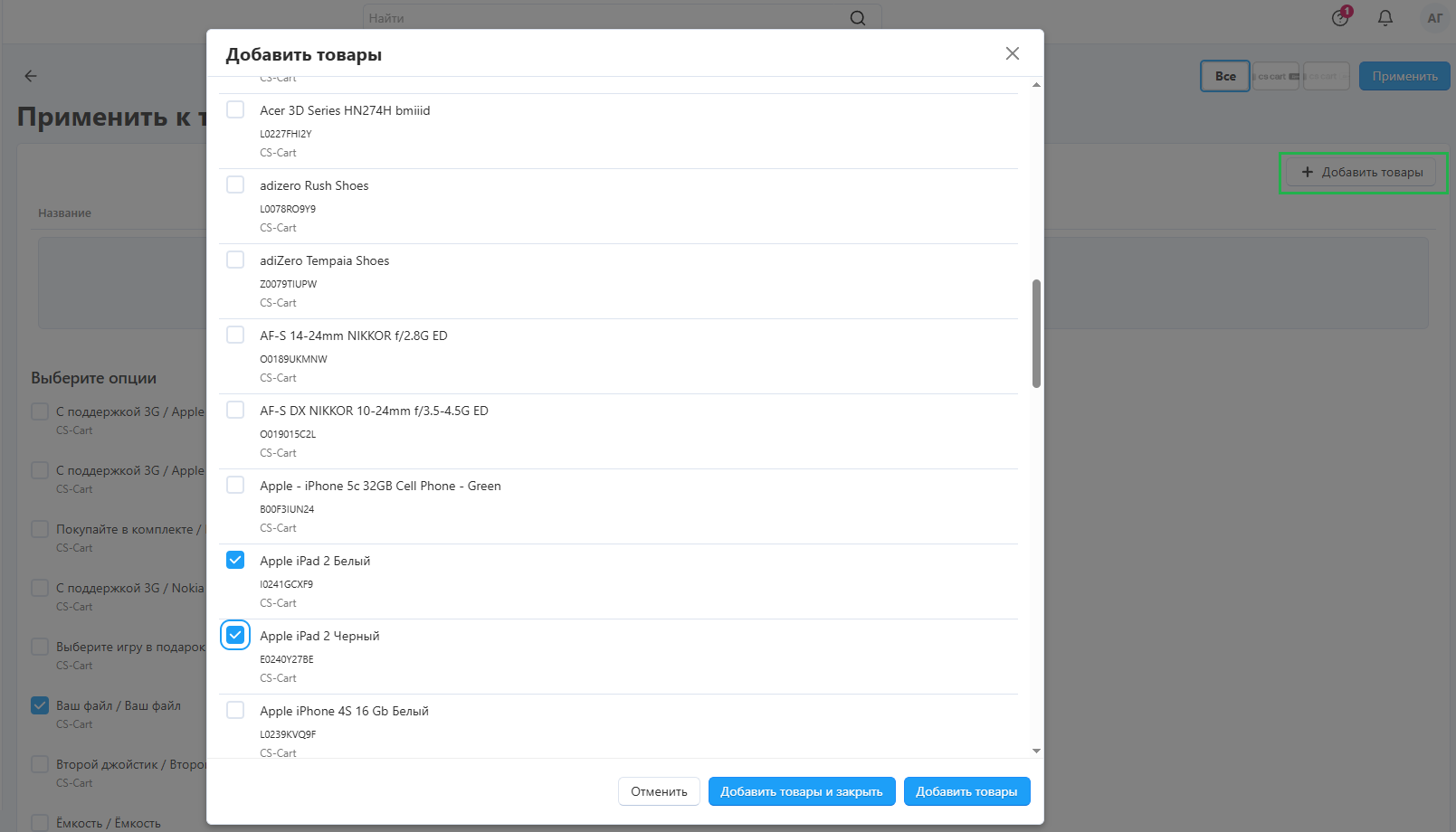Выберите товары, к которым вы хотите применить опции, и нажмите Добавить товары и закрыть или Добавить товары: