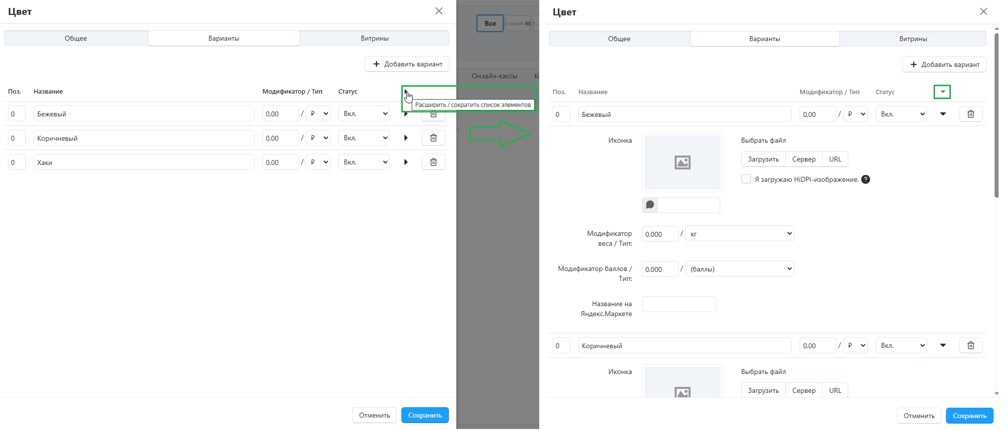 Иконка — небольшое изображение варианта. Также вы можете задать альтернативный текст для этого изображения, это полезно для поисковой оптимизации (SEO). Иконки вариантов появляются на детальной странице товара на витрине.