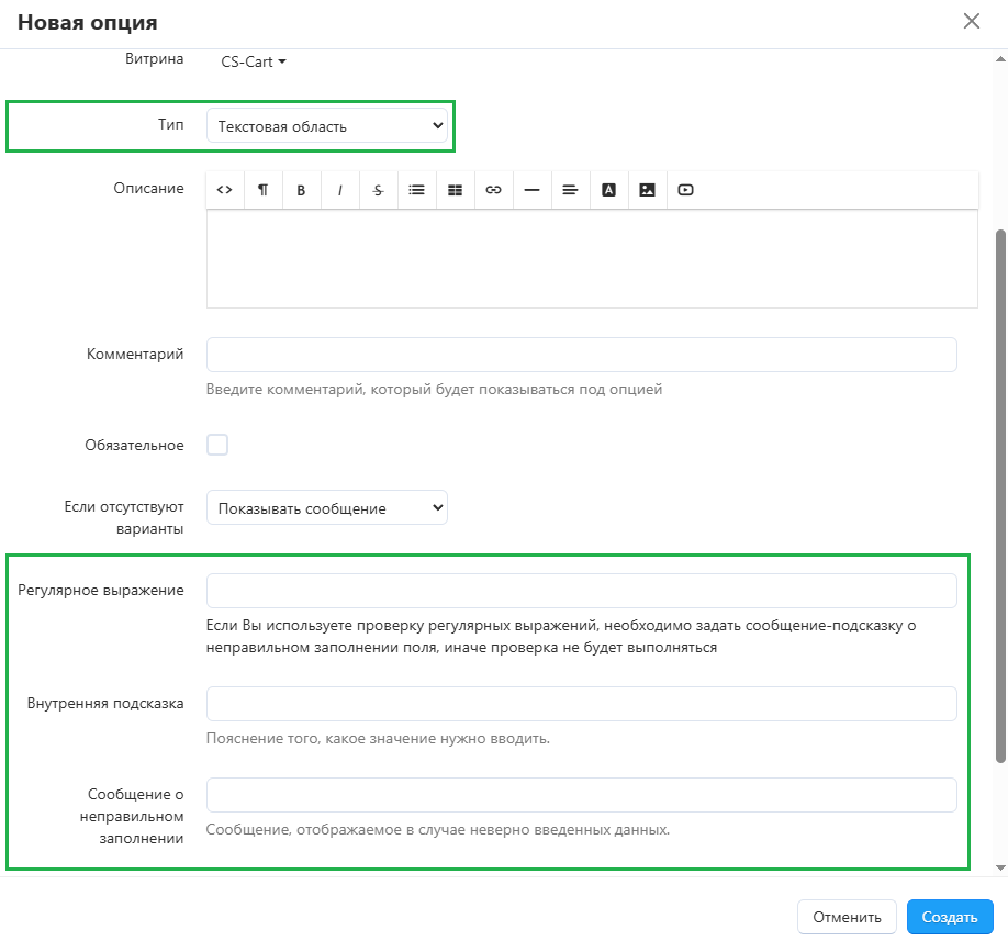 Регулярное выражение — используется для проверки значения, которое покупатель вводит в текстовую область. Например, если ввести сюда ^[a-zA-Z]{3}[0-9]{2,3}$, то от покупателя потребуется ввести 3 буквы и 2 или 3 цифры.