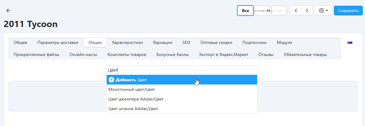 Начните вводить название опции. Если такой опции не существует в вашем магазине, нажмите Добавить: