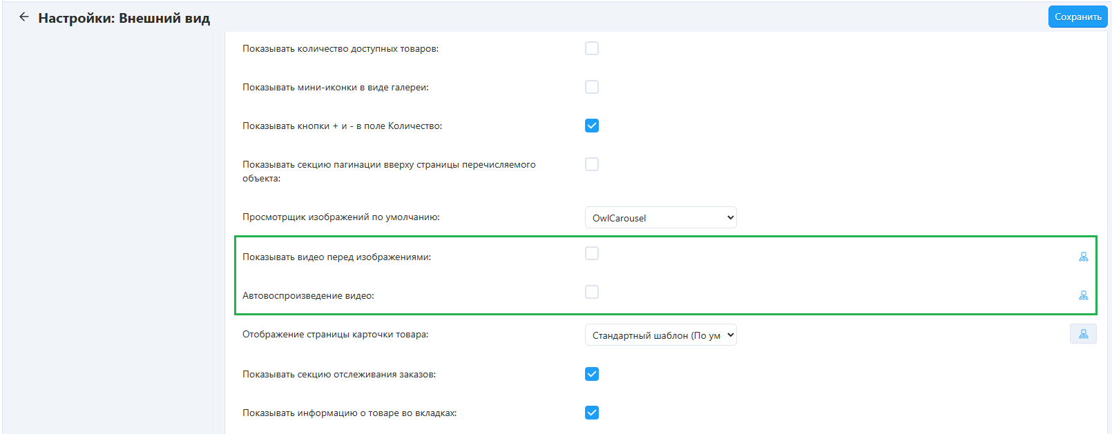 - Показывать видео перед изображениями — если вы включите эту настройку, видео будет размещено перед изображениями товара в галерее на витрине.