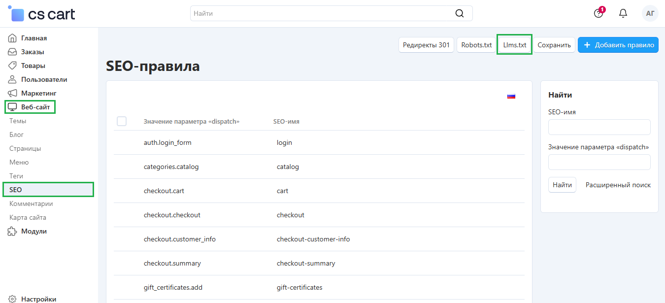 Чтобы начать редактирование llms.txt, в Панели администратора на вкладке Веб-сайт перейдите в раздел SEO.